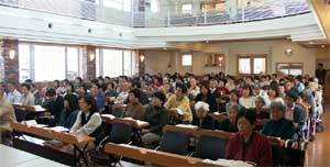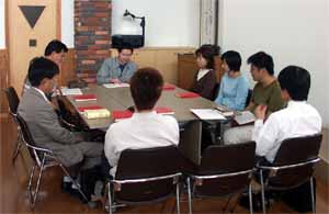 は子供が騒いでも構わない建前です。先生の短い分かりやすいお話の後、祈りのテーマを分かちあって、みんなで お祈りします。お茶も出ます。一同で自由に懇談し交わりをします。時にはご奉仕も行なわれます。何でも話し合えるので、お互いがすぐ友だちになれ