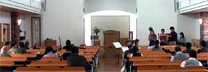 牧師先生の「一方通行的聖書講義」でなく、会衆の「自由な懇談的聖書研究」が特徴です。牧師先生は、最初10分ぐらいのコメントをしてくださいます。しかしそのあとは、自由な対話、懇談の間に勉強が進み、原則的には参考書も使いません。もちろん分からなくなれば、牧師が会衆の発言を尊重しながら、ていねいに指導してくれます。なかなか楽しく、また聖書を解読する実力がつきます。思いもよらない信徒の独創的な考え方などが出て来て、牧師先生も「わたしにも良い勉強だ」と言っておられます。いま、列王紀上、17章「預言者エリヤの活動」にさしかかっています。旧約中もっとも躍動的で、興味のある部分のひとつです。そのあとで祈り会が行われ、出席者のためにも、とりなしのためにも、祝福の集会です。