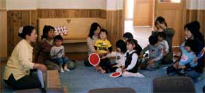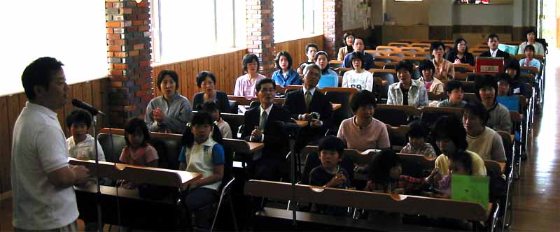 こどもの集会です。赤ちゃんから高校生まで、だいたい3、40人の生徒が、各クラスに分かれ