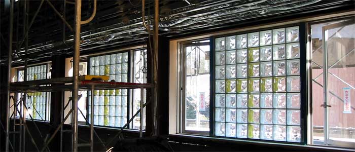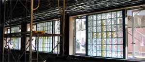 会堂のガラスブロックを中庭から撮影
